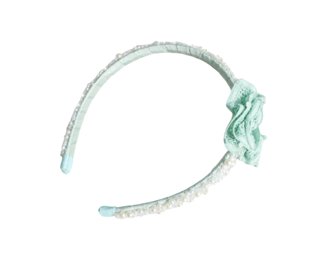 Arco bordado em pérolas e cristais com rosinha em renascença.